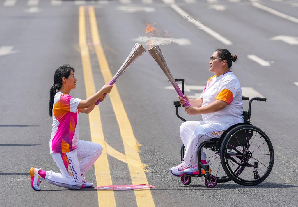 Torch bearers Tu Hongyan (L) and Yu Jianxin pass the flame during the torch relay of the 19th Asian Games in Shaoxing, east China's Zhejiang Province, Sept. 11, 2023. (Xinhua/Xu Yu)