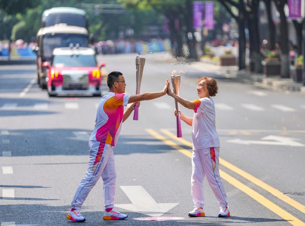 Torch bearers Shen Zhenlin (L) and Dong Qunying pass the flame during the torch relay of the 19th Asian Games in Shaoxing, east China's Zhejiang Province, Sept. 11, 2023. (Xinhua/Sun Fei)