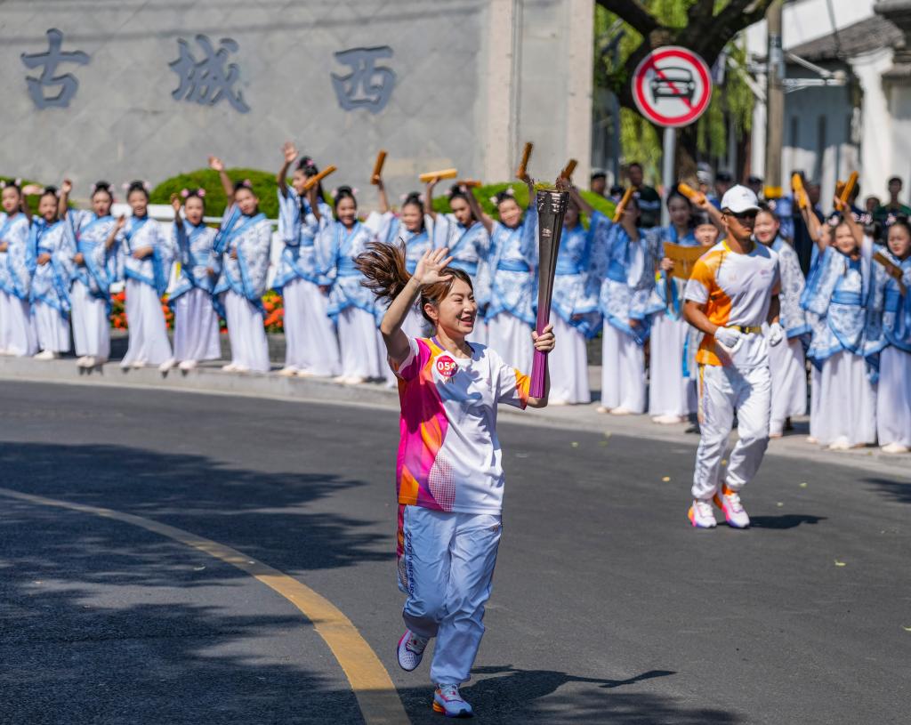 Torch bearer Lu Minjia runs with the torch during the torch relay of the 19th Asian Games in Shaoxing, east China's Zhejiang Province, Sept. 11, 2023. (Xinhua/Xu Yu)