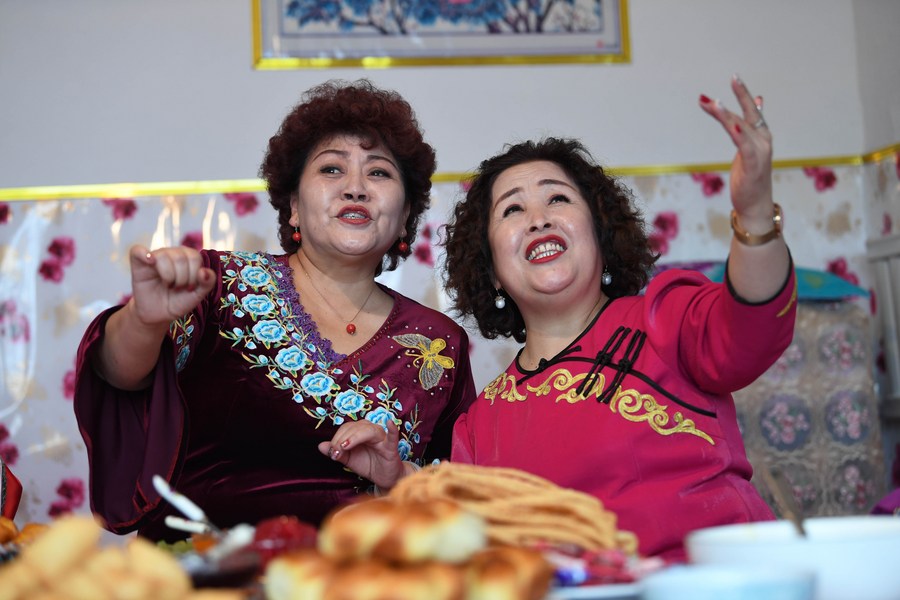Cai Yuping (L), an inheritor of Daur folk song, sings a folk song with a relative at her home in Tacheng, northwest China's Xinjiang Uygur Autonomous Region, Feb. 14, 2021. (Xinhua/Shadati)