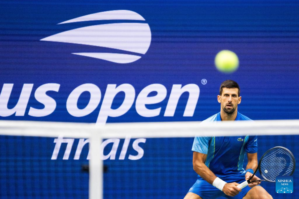 Novak Djokovic of Serbia competes during the men's singles match against Daniil Medvedev of Russia at the 2023 US Open tennis championships in New York, the United States, on Sept. 10, 2023. (Xinhua/Liu Jie)