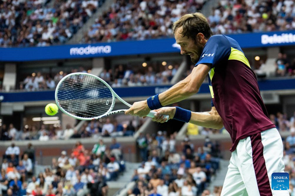 Daniil Medvedev of Russia hits a return during the men's singles match against Novak Djokovic of Serbia at the 2023 US Open tennis championships in New York, the United States, on Sept. 10, 2023. (Xinhua/Liu Jie)