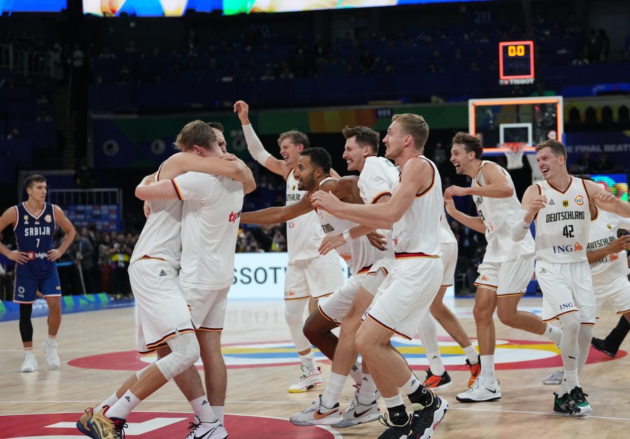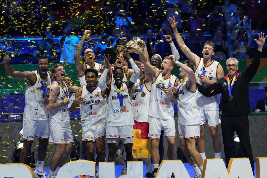 Players of Germany celebrate after winning the final against Serbia at the 2023 FIBA World Cup, Sept. 10, 2023. (Xinhua/Meng Yongmin)