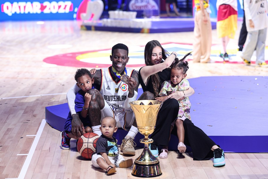 Germany players celebrate winning the FIBA World Cup final in Manila, the Philippines, Sept. 10, 2023. (Xinhua/Meng Yongmin)