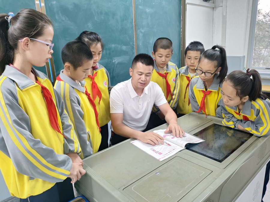 Li Junpeng teaches students at a primary school in Wuzhong City, northwest China's Ningxia Hui Autonomous Region, Sept. 8, 2023. (Xinhua/Ai Fumei)