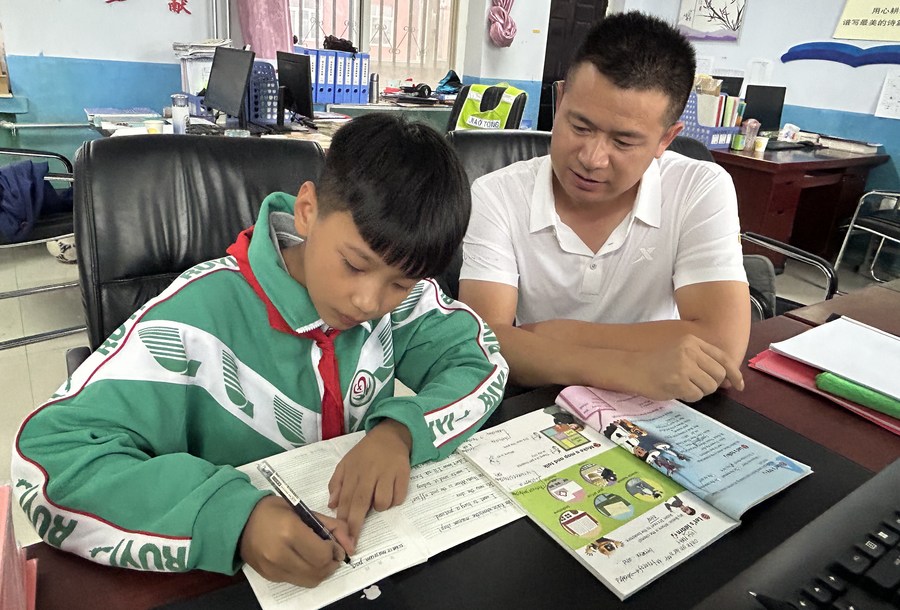 Li Junpeng tutors a student after class at a primary school in Wuzhong City, northwest China's Ningxia Hui Autonomous Region, Aug. 25, 2023. (Xinhua)