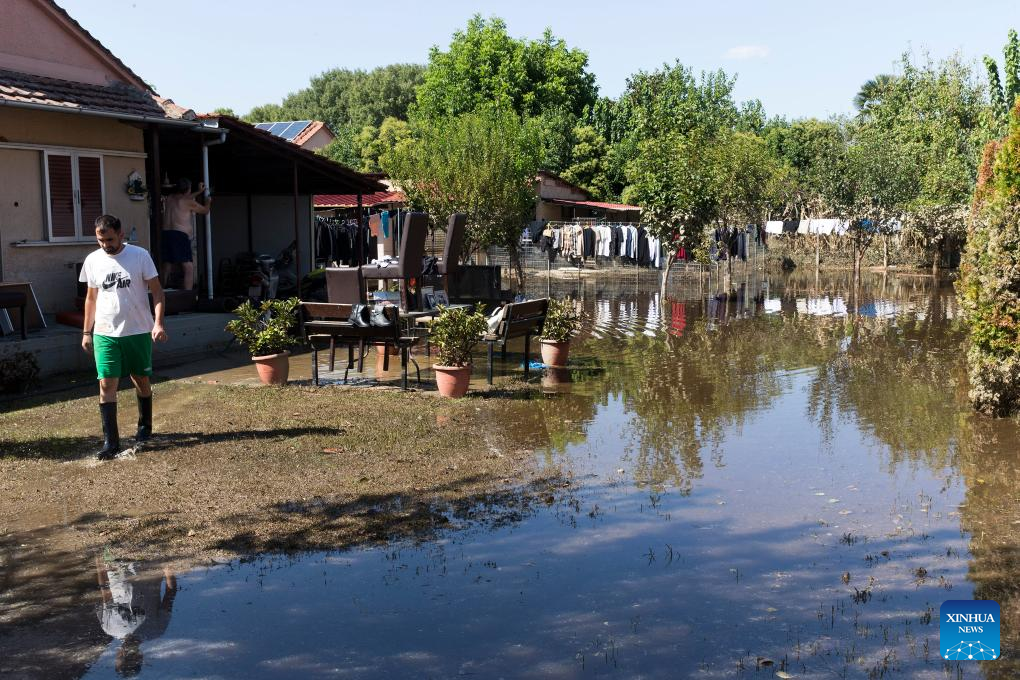 Residents clean up their properties in Karditsa, Thessaly region, Greece, on Sept. 10, 2023. Greek Prime Minister Kyriakos Mitsotakis announced on Sunday the first package of relief measures for the flood-stricken in central Greece, as the flood-caused death toll increased to 15, Greek national broadcaster ERT reported. (Xinhua/Marios Lolos)