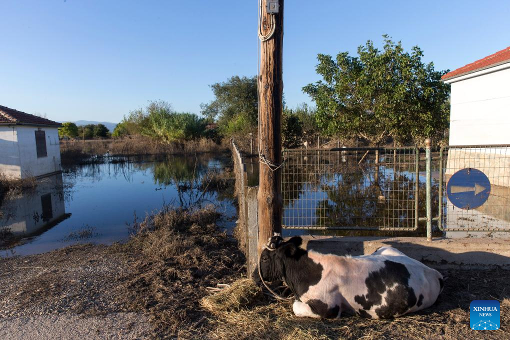 This photo taken on Sept. 11, 2023 shows a cow near flooded houses in Karditsa, Thessaly region, Greece. Greek Prime Minister Kyriakos Mitsotakis announced on Sunday the first package of relief measures for the flood-stricken regions in central Greece, as the flood-caused death toll increased to 15, Greek national broadcaster ERT reported. (Xinhua/Marios Lolos)