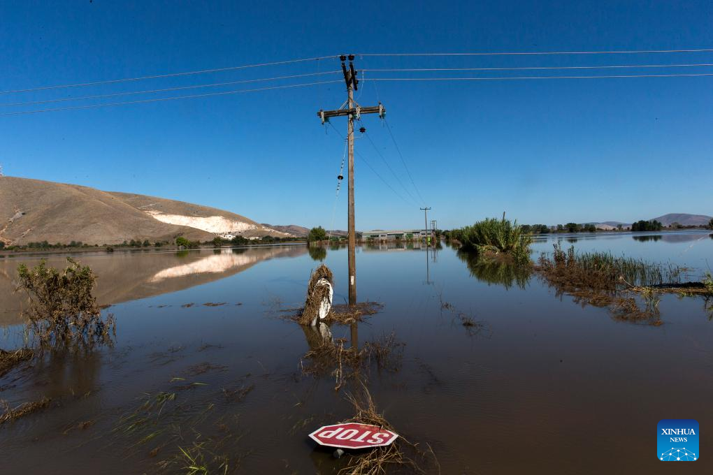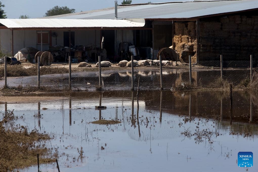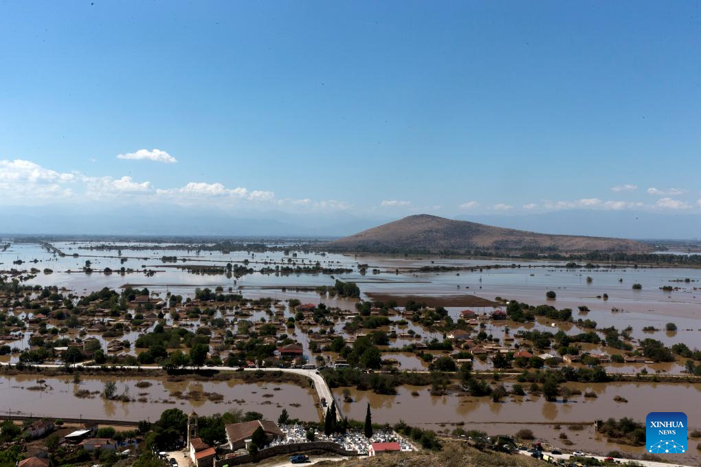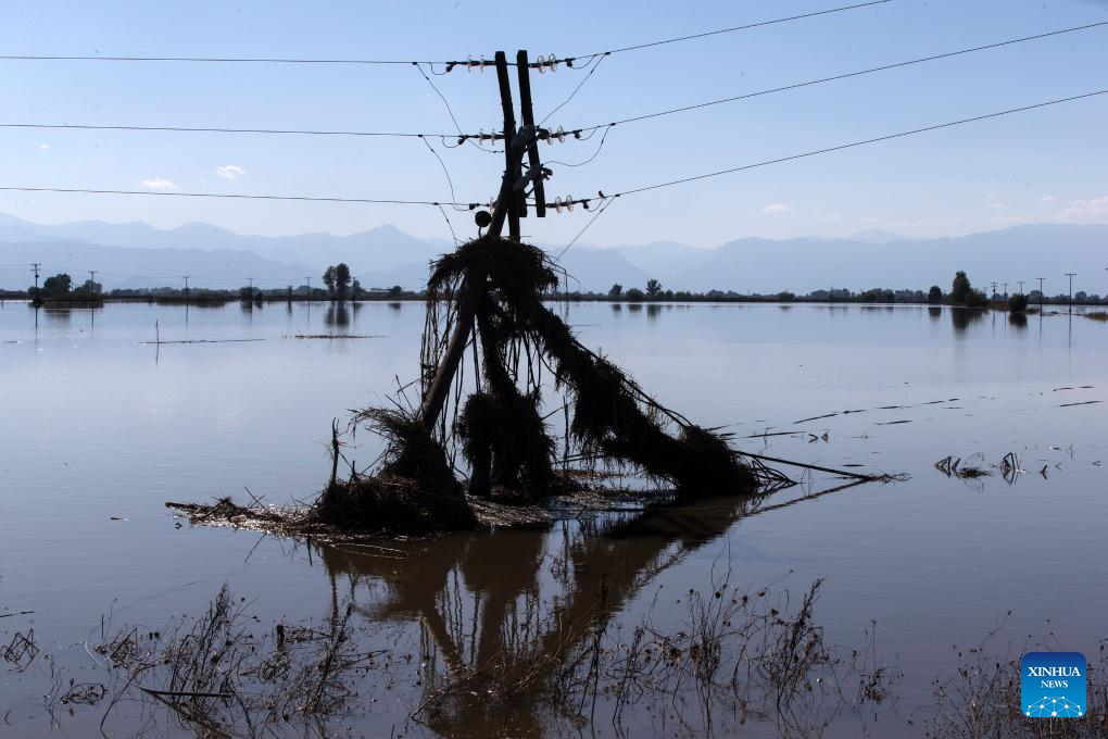 This photo taken on Sept. 10, 2023 shows a flooded area in Larissa area, Thessaly region, Greece. Greek Prime Minister Kyriakos Mitsotakis announced on Sunday the first package of relief measures for the flood-stricken in central Greece, as the flood-caused death toll increased to 15, Greek national broadcaster ERT reported. (Xinhua/Marios Lolos)