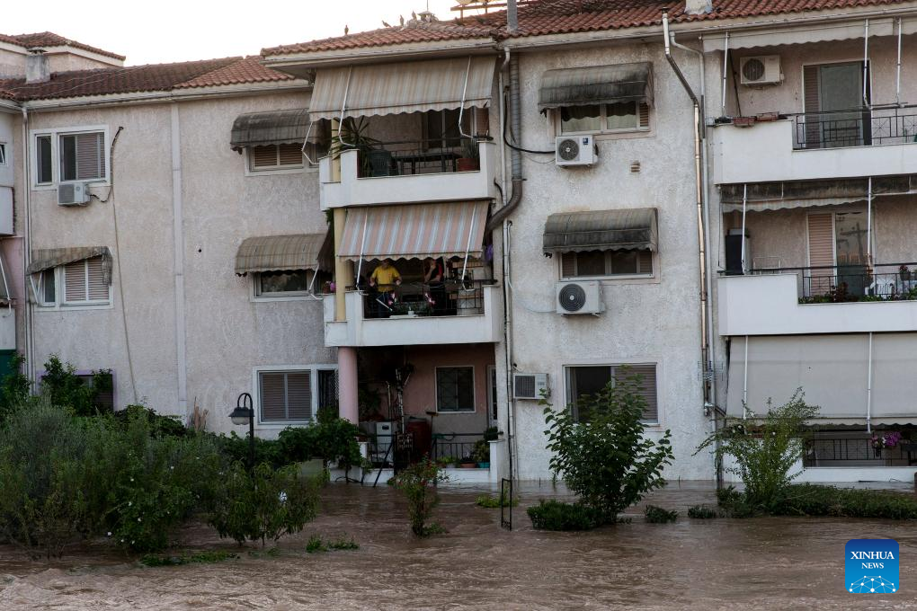 This photo taken on Sept. 10, 2023 shows residents stranded by flood in Larissa area, Thessaly region, Greece. Greek Prime Minister Kyriakos Mitsotakis announced on Sunday the first package of relief measures for the flood-stricken in central Greece, as the flood-caused death toll increased to 15, Greek national broadcaster ERT reported. (Xinhua/Marios Lolos)