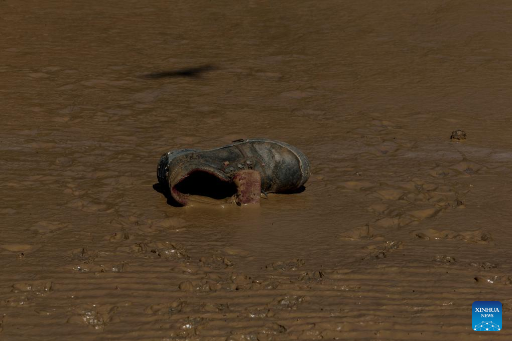 This photo taken on Sept. 11, 2023 shows a shoe in the mud in Karditsa, Thessaly region, Greece. Greek Prime Minister Kyriakos Mitsotakis announced on Sunday the first package of relief measures for the flood-stricken regions in central Greece, as the flood-caused death toll increased to 15, Greek national broadcaster ERT reported. (Xinhua/Marios Lolos)