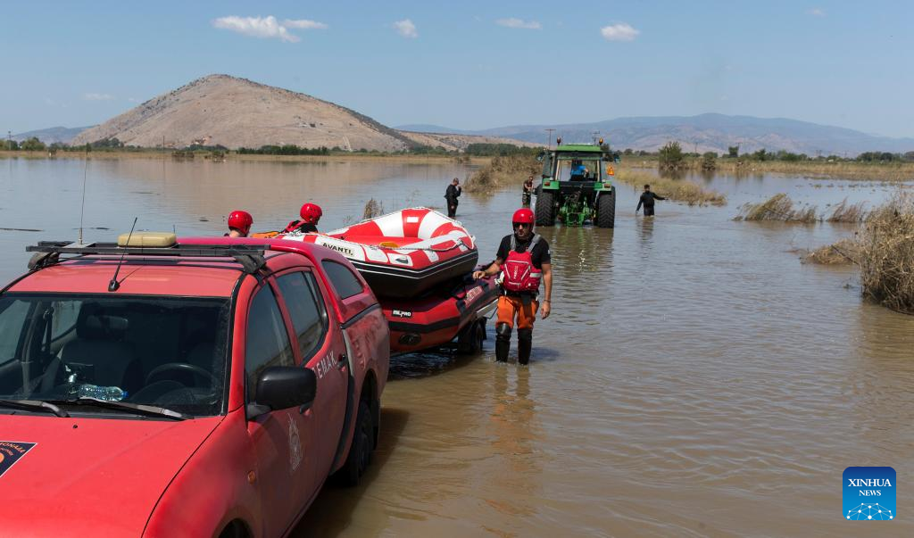 Members of the Fire Brigade evacuate residents with boats in Larissa area, Thessaly region, Greece, on Sept. 10, 2023. Greek Prime Minister Kyriakos Mitsotakis announced on Sunday the first package of relief measures for the flood-stricken in central Greece, as the flood-caused death toll increased to 15, Greek national broadcaster ERT reported. (Xinhua/Marios Lolos)