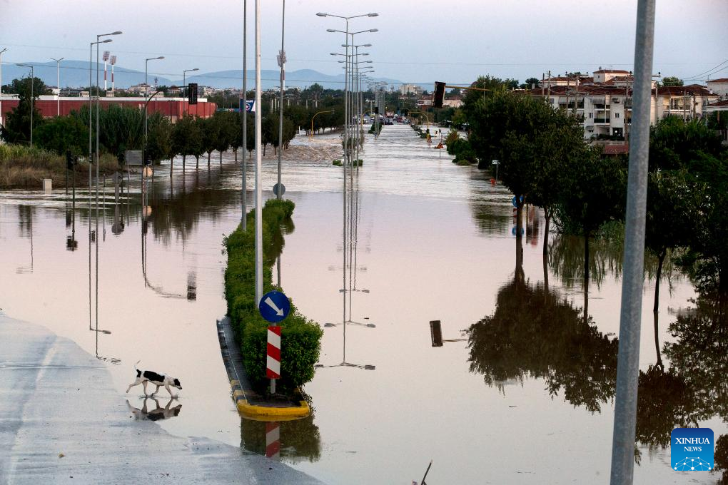This photo taken on Sept. 11, 2023 shows a flooded road in Karditsa, Thessaly region, Greece. Greek Prime Minister Kyriakos Mitsotakis announced on Sunday the first package of relief measures for the flood-stricken regions in central Greece, as the flood-caused death toll increased to 15, Greek national broadcaster ERT reported. (Xinhua/Marios Lolos)