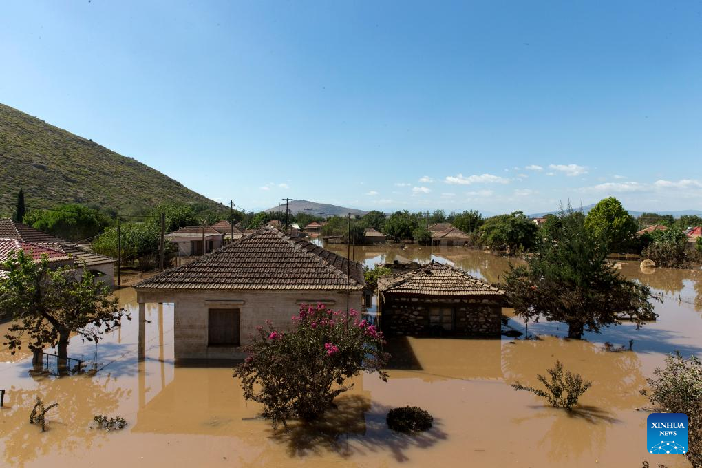 This photo taken on Sept. 11, 2023 shows flooded houses in Karditsa, Thessaly region, Greece. Greek Prime Minister Kyriakos Mitsotakis announced on Sunday the first package of relief measures for the flood-stricken regions in central Greece, as the flood-caused death toll increased to 15, Greek national broadcaster ERT reported. (Xinhua/Marios Lolos)