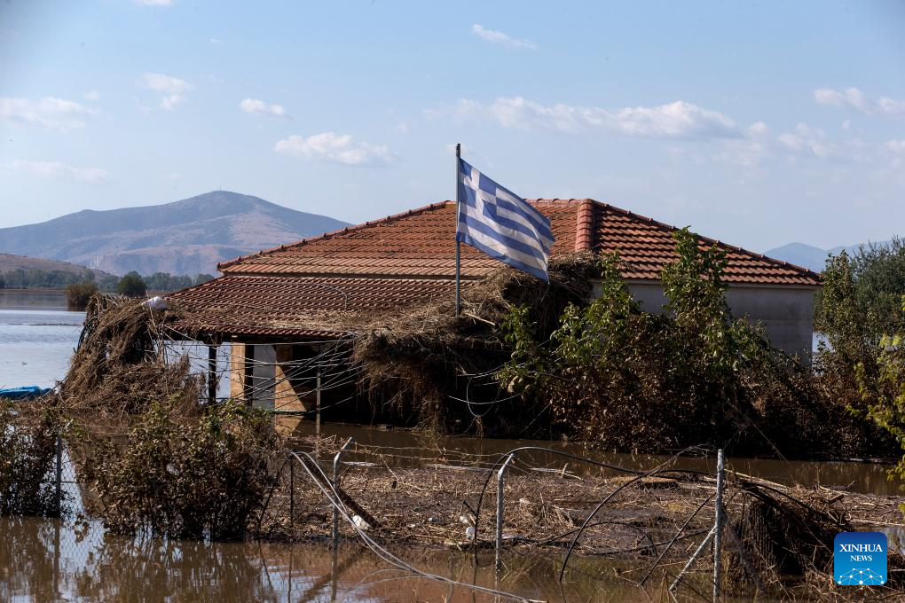 This photo taken on Sept. 11, 2023 shows a flooded house in Karditsa, Thessaly region, Greece. Greek Prime Minister Kyriakos Mitsotakis announced on Sunday the first package of relief measures for the flood-stricken regions in central Greece, as the flood-caused death toll increased to 15, Greek national broadcaster ERT reported. (Xinhua/Marios Lolos)