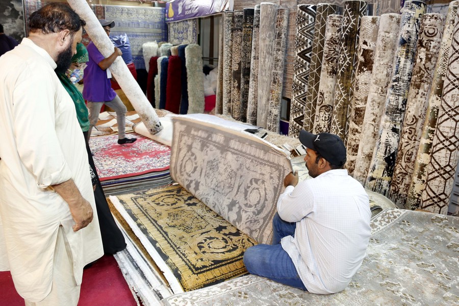 People check handmade carpets during the Home Decor and Furniture Expo in Islamabad, capital of Pakistan, on Sept. 10, 2023. (Xinhua/Ahmad Kamal)