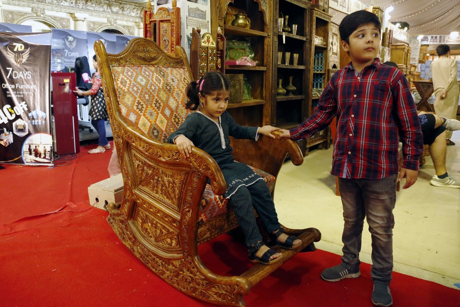 Children visit the Home Decor and Furniture Expo in Islamabad, capital of Pakistan, on Sept. 10, 2023. (Xinhua/Ahmad Kamal)