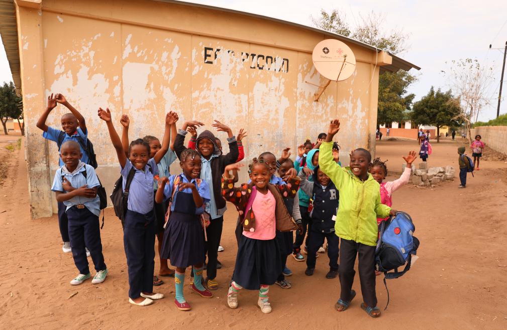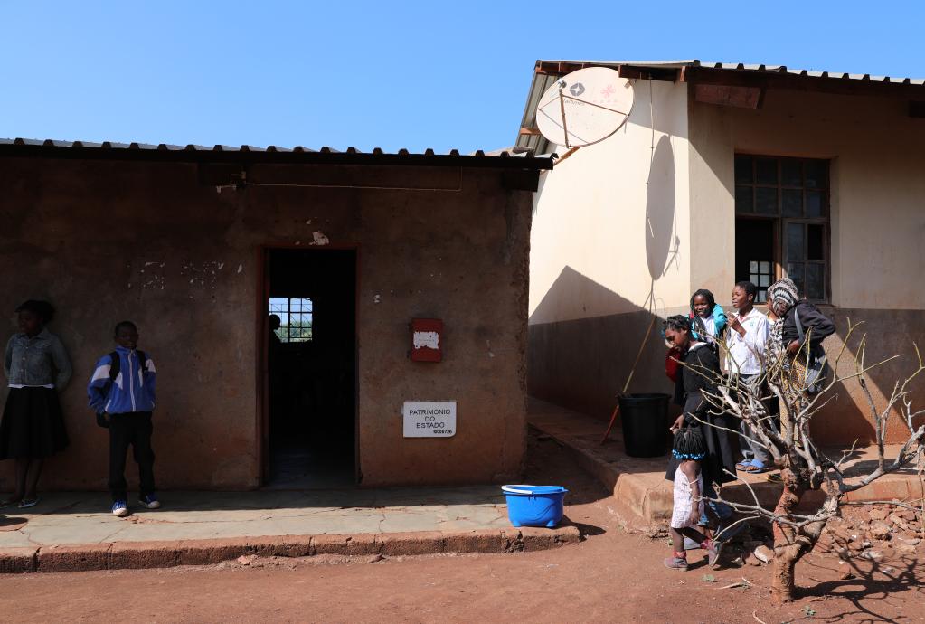 Students rest in front of a classroom equipped with Chinese-aided satellite television receiving antenna at a school in Goba Village, Maputo Province, Mozambique, on July 26, 2023. (Xinhua/Dong Jianghui)