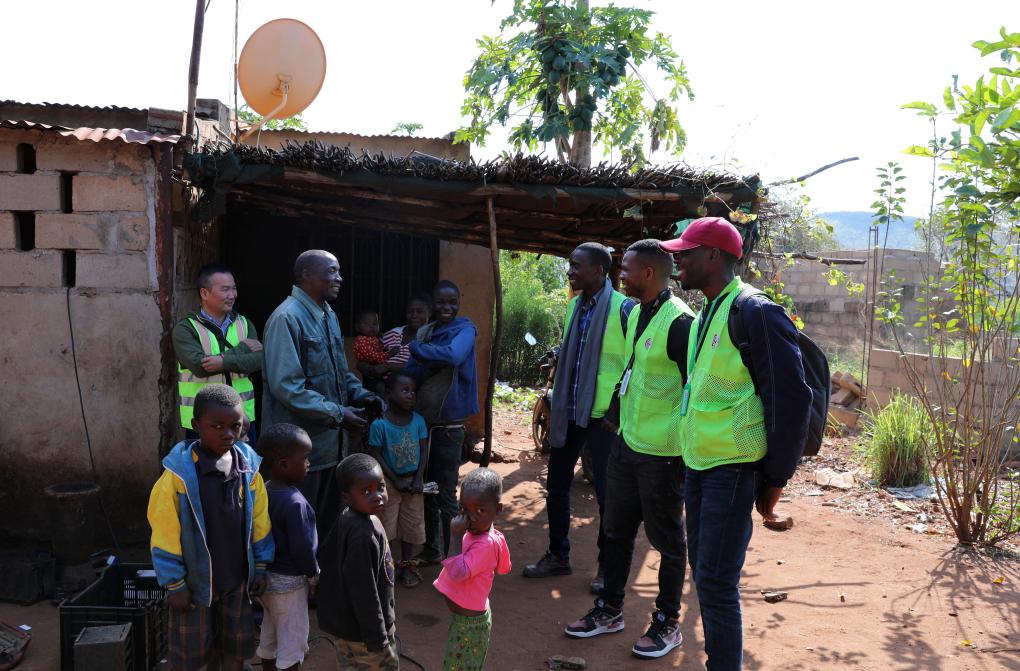 Nunes Guardagea (2nd R) and his colleagues communicate with villagers who use Chinese-aided satellite television devices in Goba Village, Maputo Province, Mozambique, July 26, 2023. (Xinhua/Dong Jianghui)