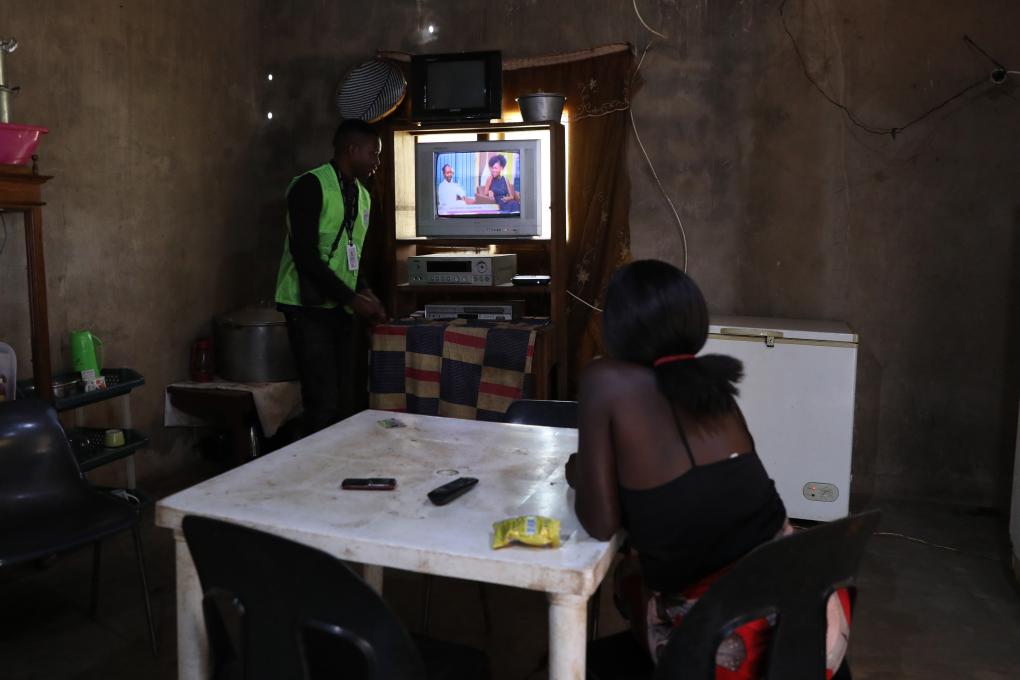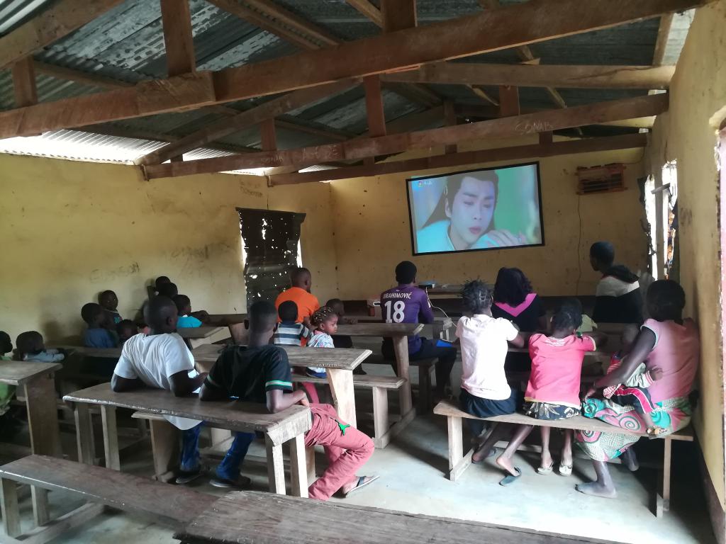 People watch a television program through projection in Metuchira Village, Sofala Province, Mozambique, May 13, 2019. (StarTimes Mozambique Branch/Handout via Xinhua)