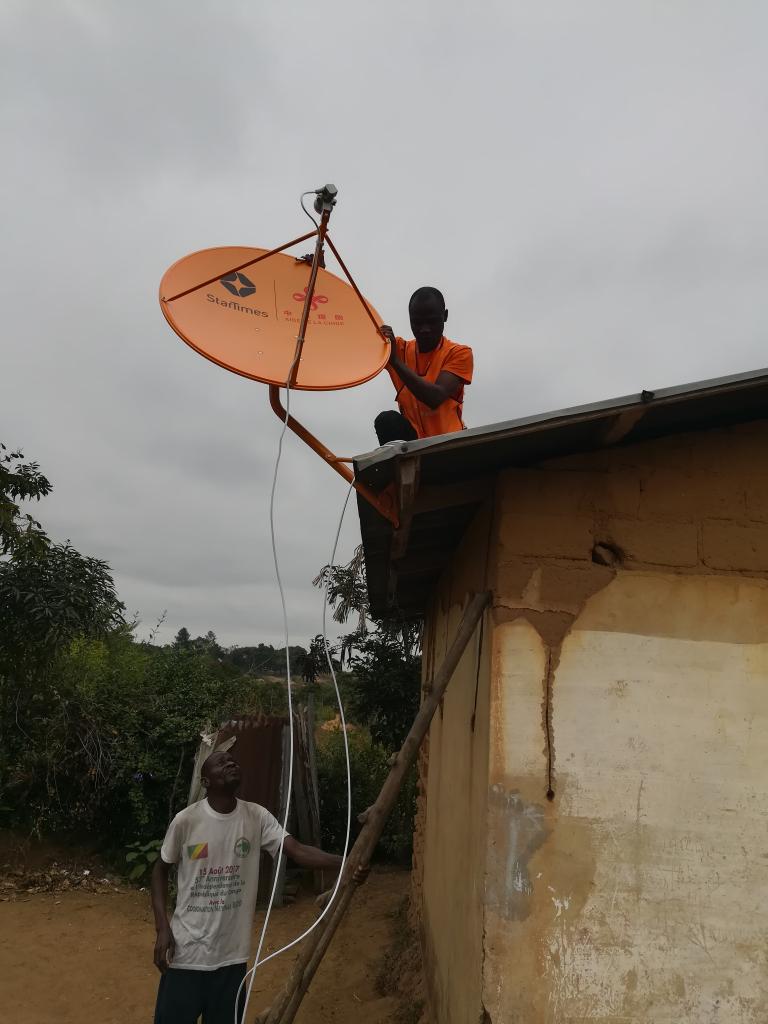 Staff members of StarTimes install Chinese-aided satellite television receiving antenna at Metuchira Village, Sofala Province, Mozambique, May 13, 2019. (StarTimes Mozambique Branch/Handout via Xinhua)