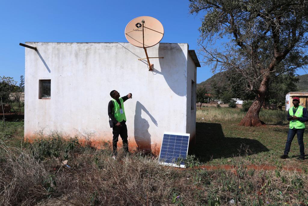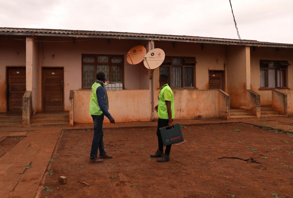 Nunes Guardagea (R) and his colleague check a Chinese-aided satellite television receiving antenna at Mafuiane Village, Maputo Province, Mozambique, July 25, 2023. (Xinhua/Dong Jianghui)