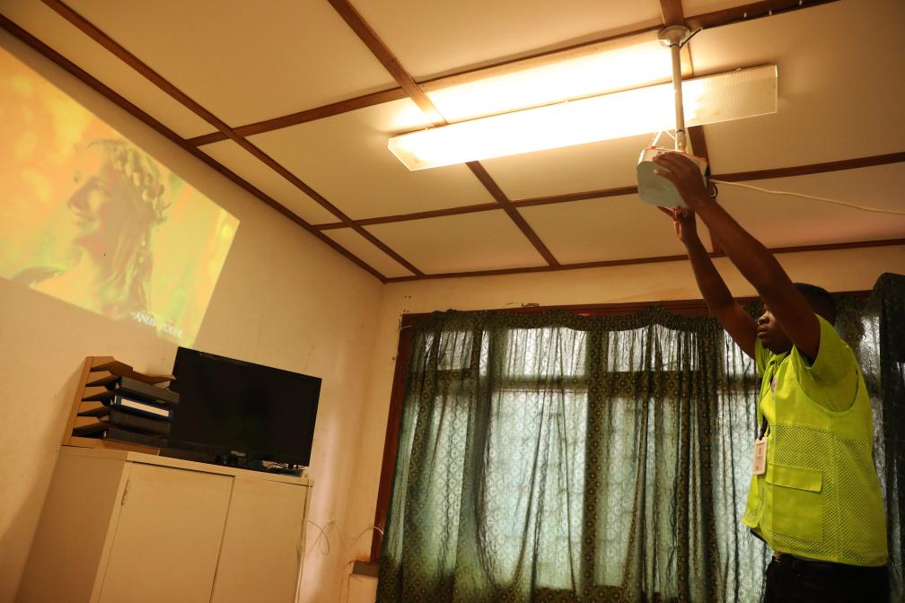 Nunes Guardagea checks a Chinese-aided projection television device in Goba Village, Maputo Province, Mozambique, July 26, 2023. (Xinhua/Dong Jianghui)
