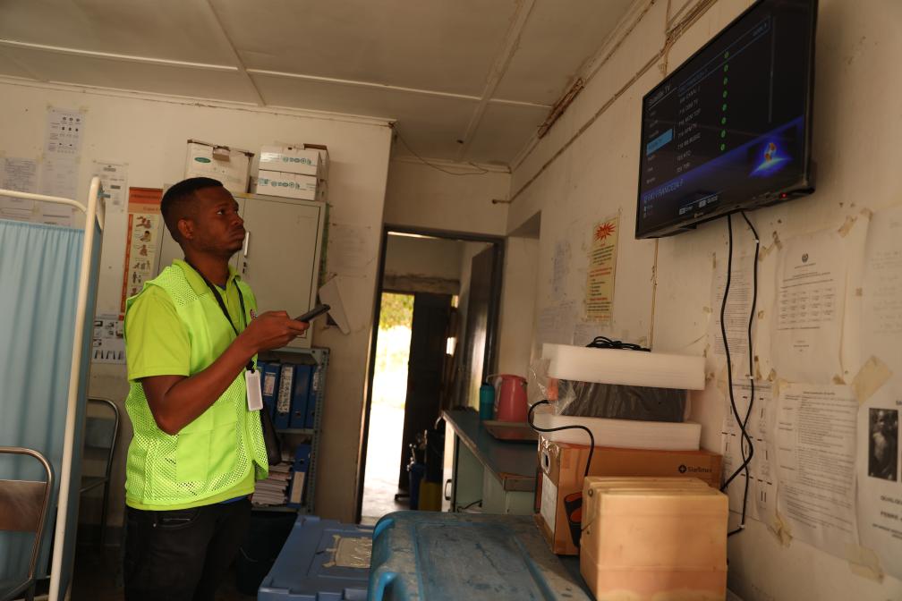 Nunes Guardagea inspects a Chinese-aided digital television set at a hospital in Picoco Village, Maputo Province, Mozambique, July 25, 2023. (Xinhua/Dong Jianghui)