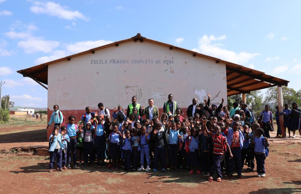 Nunes Guardagea and his colleagues pose for a group photo with teachers and students at a school in Goba Village, Maputo Province, Mozambique, July 26, 2023. (Xinhua/Dong Jianghui)