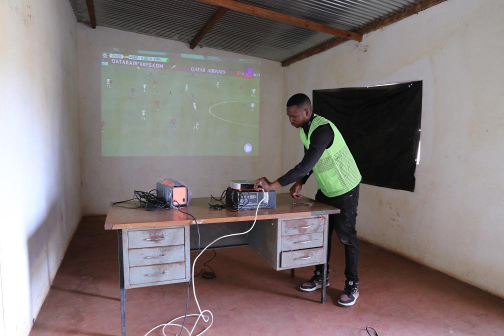 Nunes Guardagea checks the signal of a Chinese-aided projection television device in Mafuiane Village, Maputo Province, Mozambique, July 25, 2023. (Xinhua/Dong Jianghui)