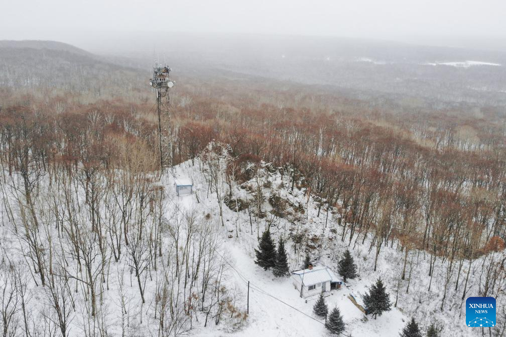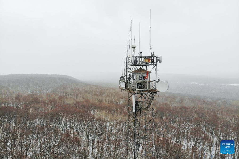 This aerial photo shows the Caiqin Watchtower in Zhanhe forest farm in the city of Heihe, northeast China's Heilongjiang Province, March 23, 2023. (Xinhua/Xie Jianfei)
