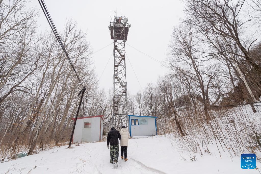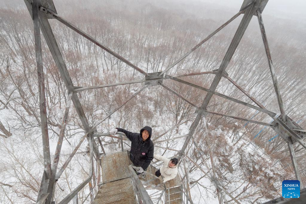 Wang Liuyang (L) and Xu Pan climb the Caiqin Watchtower in Zhanhe forest farm in the city of Heihe, northeast China's Heilongjiang Province, March 23, 2023. (Xinhua/Xie Jianfei)
