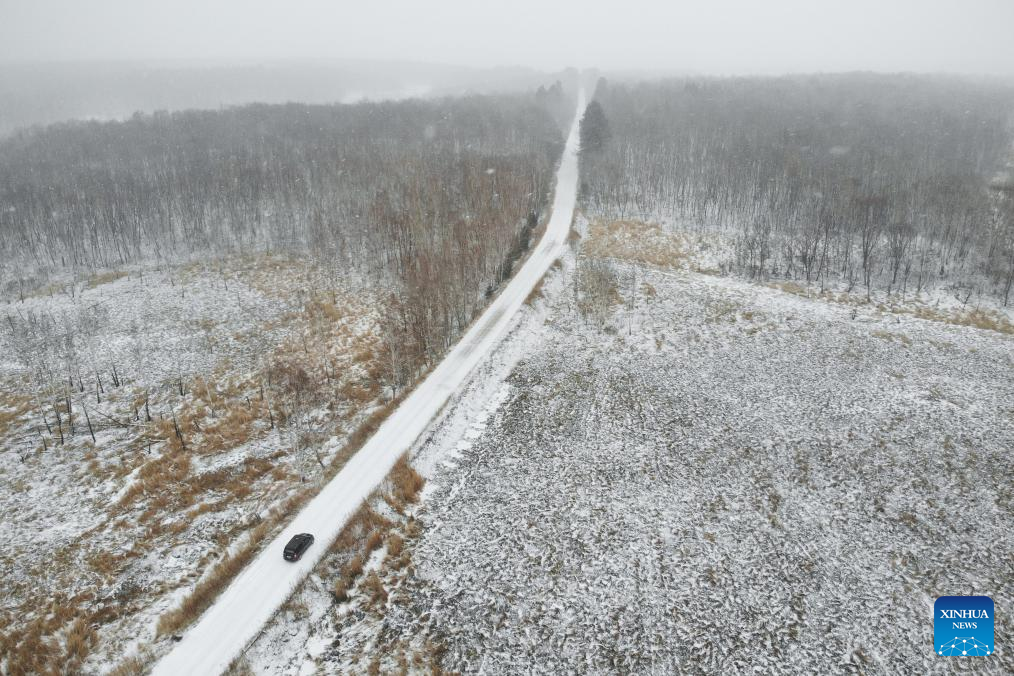 This aerial photo shows Wang Liuyang, Xu Pan and Wang Xuetang driving to the Caiqin Watchtower in Zhanhe forest farm in the city of Heihe, northeast China's Heilongjiang Province, March 23, 2023. (Xinhua/Xie Jianfei)