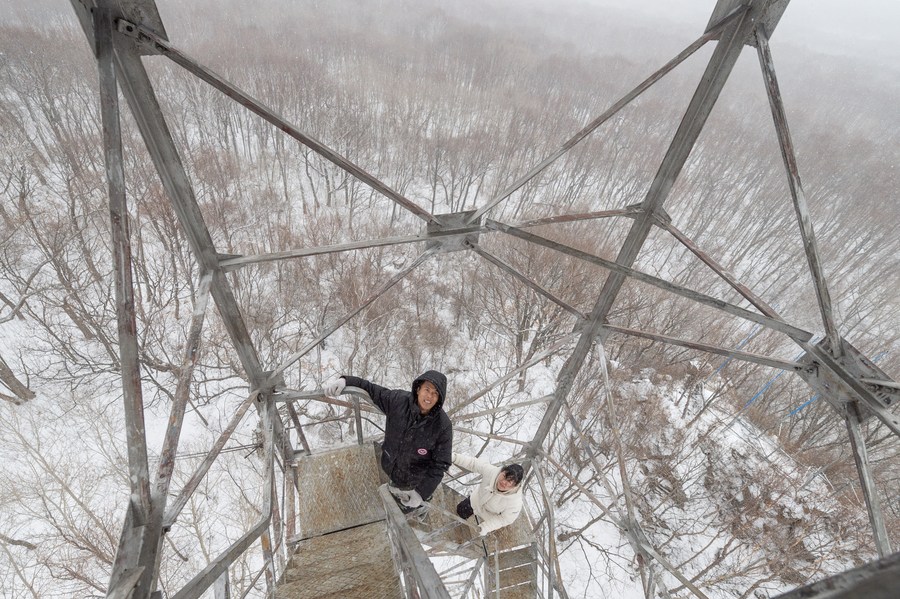 Wang Liuyang (L) and Xu Pan climb the Caiqin Watchtower in Zhanhe forest farm in the city of Heihe, northeast China's Heilongjiang Province, March 23, 2023. (Xinhua/Xie Jianfei)