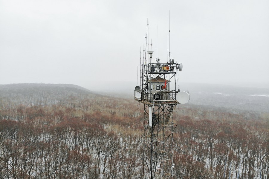 This aerial photo shows the Caiqin Watchtower in Zhanhe forest farm in the city of Heihe, northeast China's Heilongjiang Province, March 23, 2023. (Xinhua/Xie Jianfei)