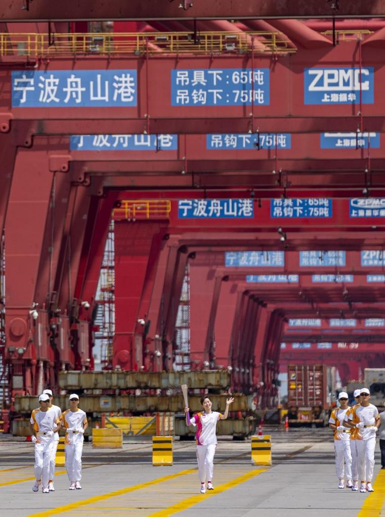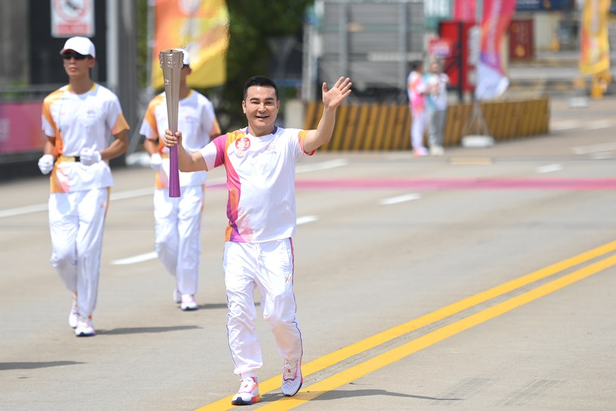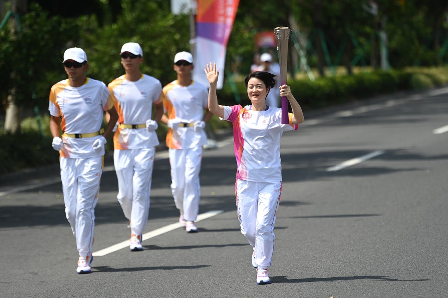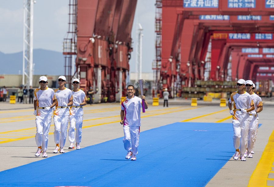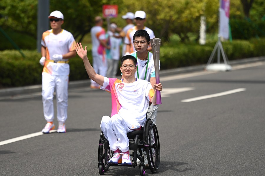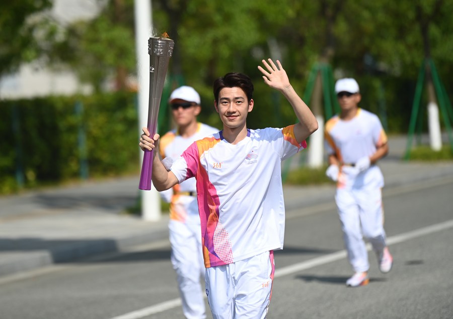 Torch bearer Fan Bing holds the torch during the torch relay of the 19th Asian Games in Ningbo, east China's Zhejiang Province, Sept. 12, 2023. (Xinhua/Huang Zongzhi)