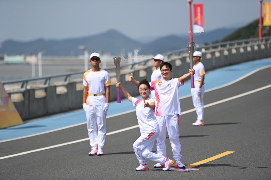 Torch bearers Li Benjun (R) and Dong Yinyin pose during the torch relay of the 19th Asian Games in Ningbo, east China's Zhejiang Province, Sept. 12, 2023. (Xinhua/Sun Fei)