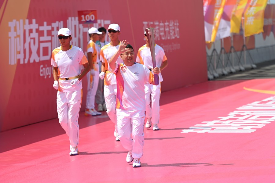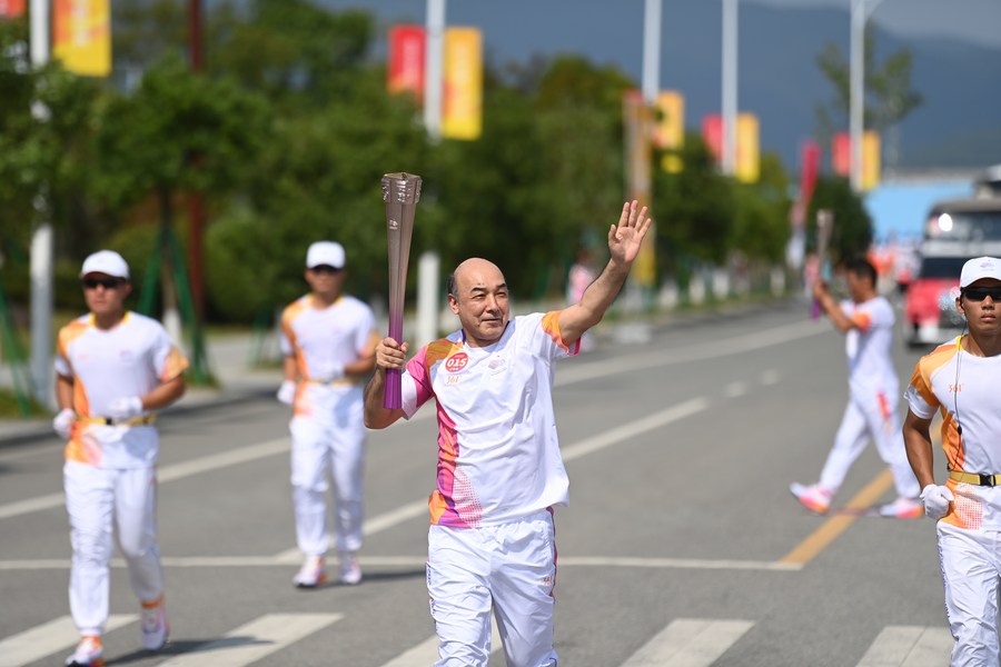Torch bearer Li Benjun runs with the torch during the torch relay of the 19th Asian Games in Ningbo, east China's Zhejiang Province, Sept. 12, 2023. (Xinhua/Sun Fei)