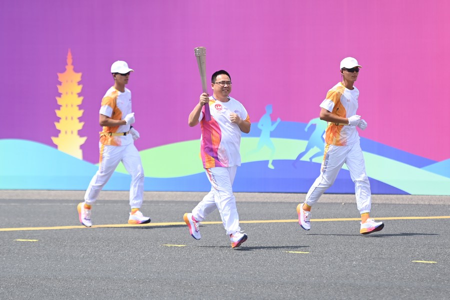 Torch bearer Wang Chang runs with the torch during the torch relay of the 19th Asian Games in Ningbo, east China's Zhejiang Province, Sept. 12, 2023. (Xinhua/Huang Zongzhi)