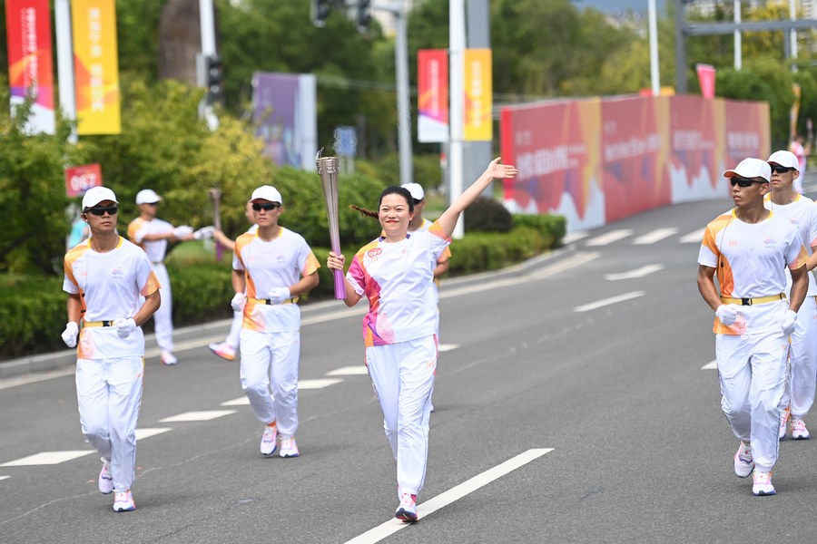 Torch bearer Shi Zhen runs with the torch during the torch relay of the 19th Asian Games in Ningbo, east China's Zhejiang Province, Sept. 12, 2023. (Xinhua/Huang Zongzhi)