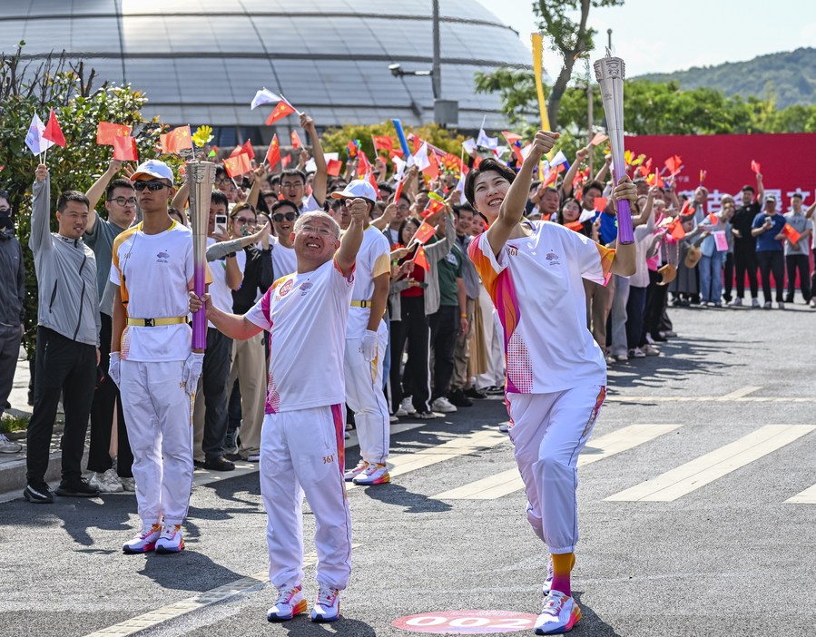Torch bearers Li Benjun (R) and Zhu Shijie pose during the torch relay of the 19th Asian Games in Ningbo, east China's Zhejiang Province, Sept. 12, 2023. (Xinhua/Sun Fei)
