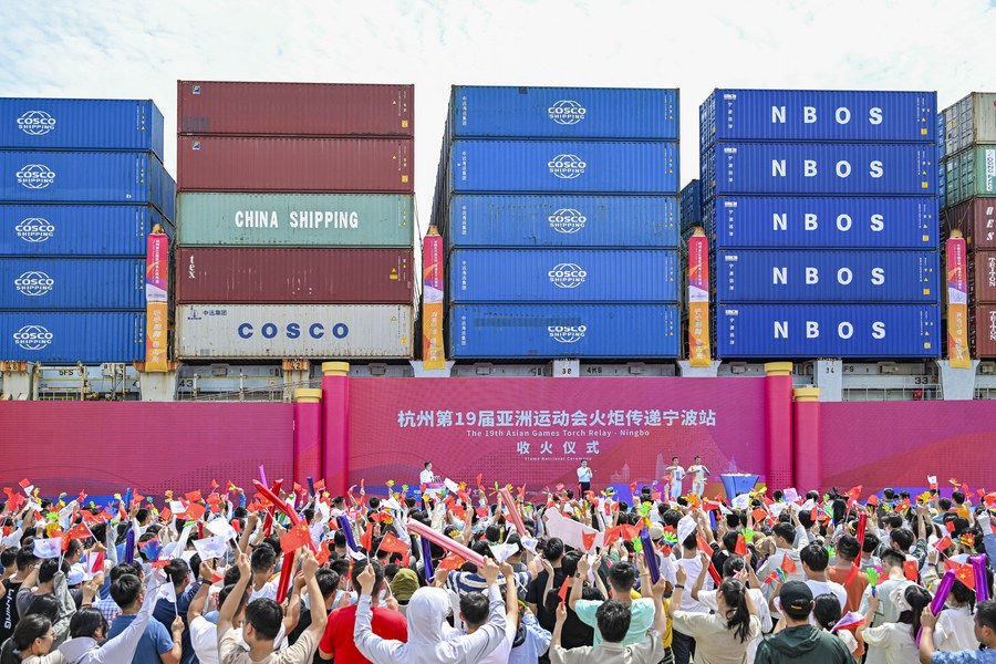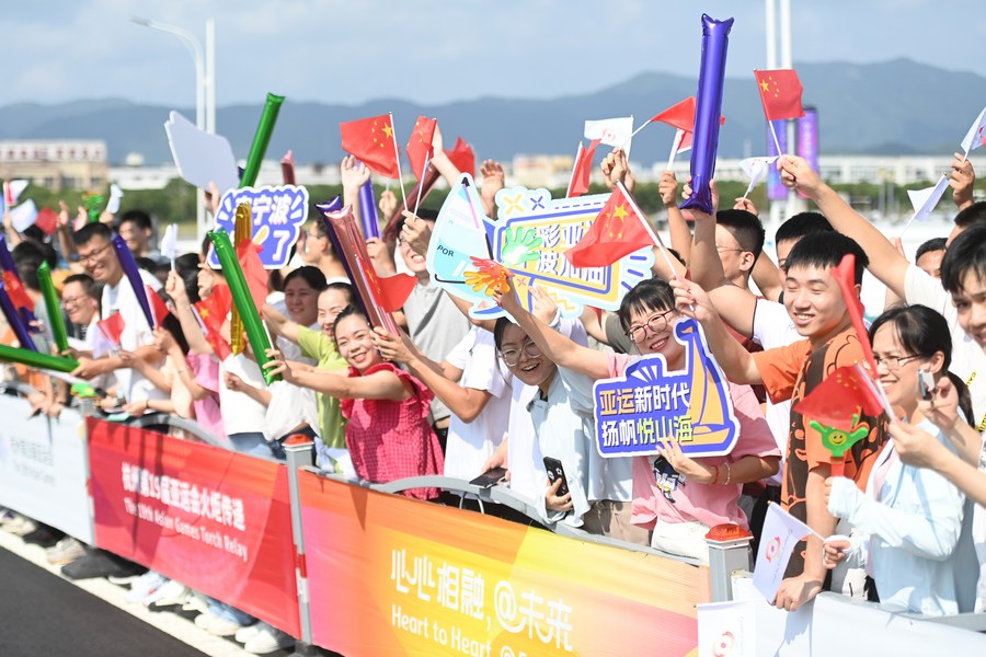 People watch the torch relay of the 19th Asian Games in Ningbo, east China's Zhejiang Province, Sept. 12, 2023. (Xinhua/Huang Zongzhi)