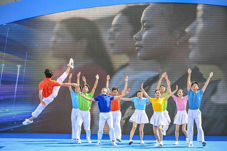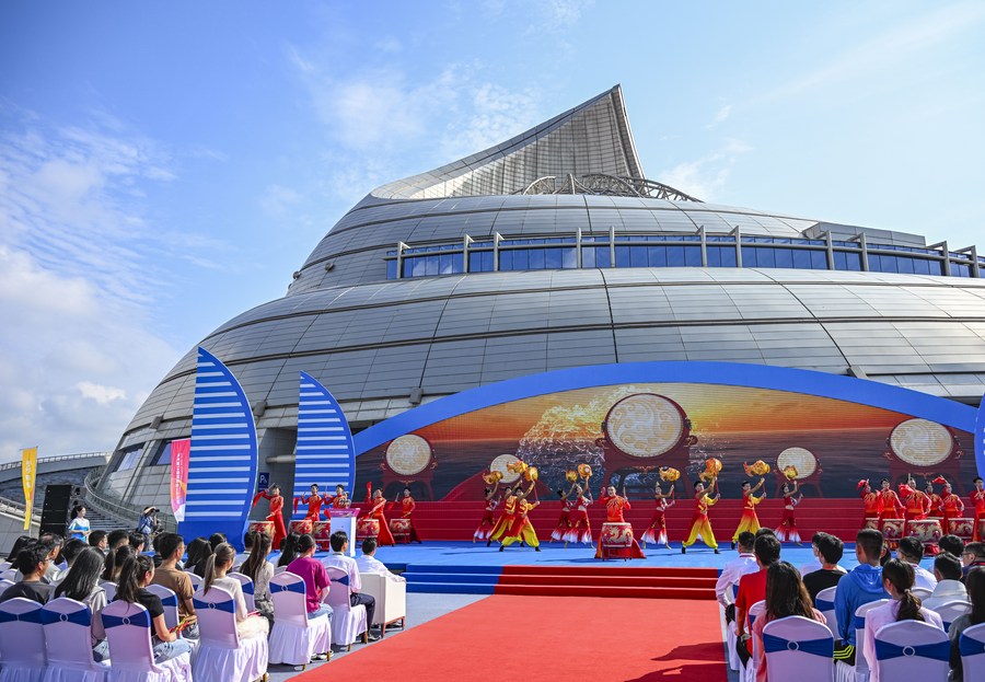 Dancers perform during the beginning ceremony of the torch relay of the 19th Asian Games in Ningbo, east China's Zhejiang Province, Sept. 12, 2023. (Xinhua/Sun Fei)