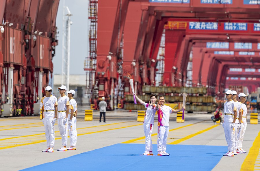 Torch bearers Li Benjun (R) and Dong Yinyin pass the flame during the torch relay of the 19th Asian Games in Ningbo, east China's Zhejiang Province, Sept. 12, 2023. (Xinhua/Sun Fei)