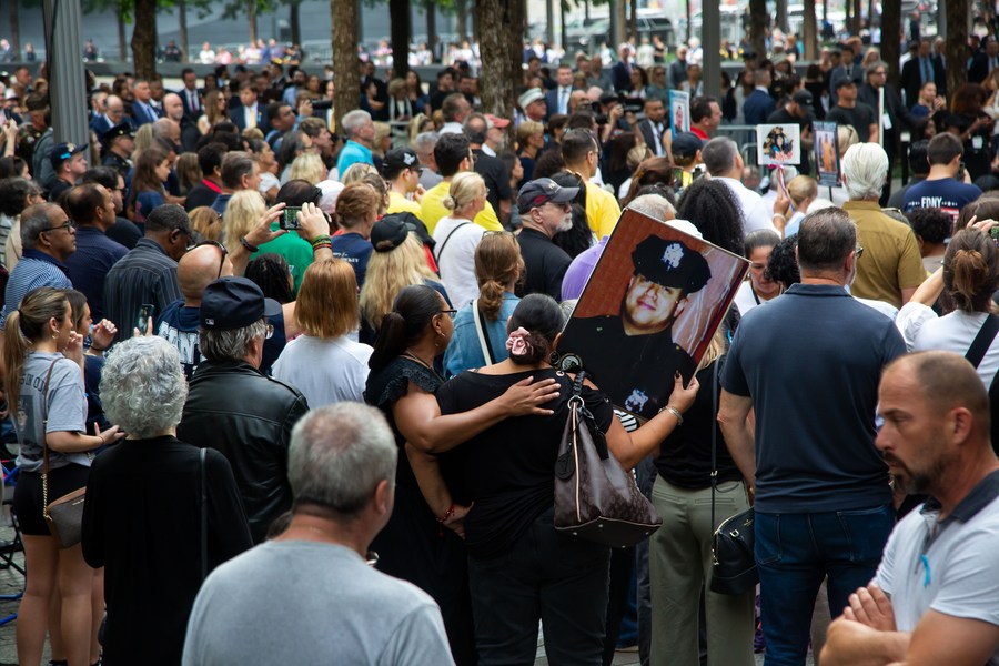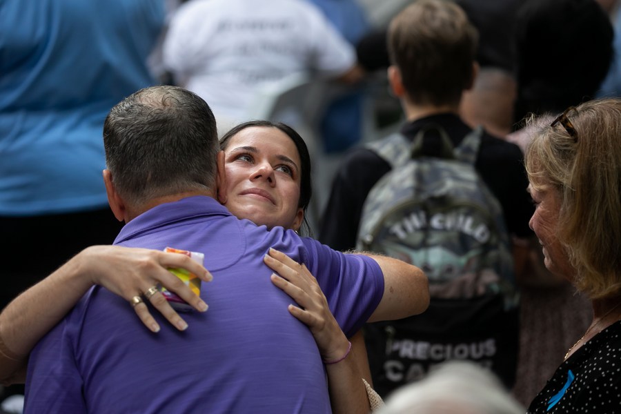People embrace during a commemoration ceremony of the 22nd anniversary of the 9/11 attacks in New York, the United States, on Sept. 11, 2023. (Photo by Michael Nagle/Xinhua)