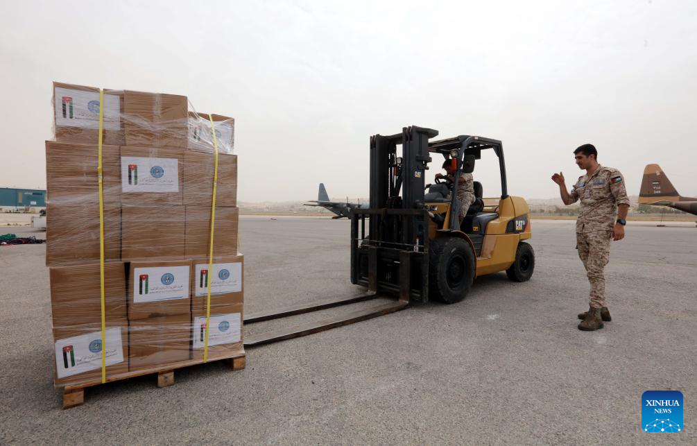 Staff members move humanitarian aid at a military airport in Amman, Jordan, Sept. 13, 2023. King Abdullah II of Jordan extended condolences over the victims of the deadly floods in eastern Libya, and a government-run organization dispatched an airplane loaded with humanitarian aid on Wednesday. (Photo by Mohammad Abu Ghosh/Xinhua)