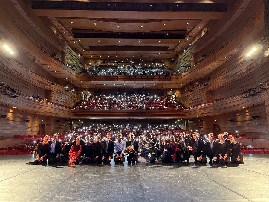 Artists of the Rome Ballet Company pose for a photo on the stage in Shenzhen, south China's Guangdong Province, Sept. 8, 2023. (Xinhua)