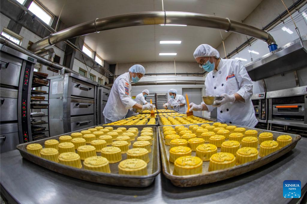 Workers make moon cakes at a workshop in Taizhou City, east China's Jiangsu Province, Sept. 13, 2023.