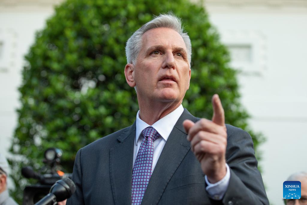 File photo taken on May 22, 2023 shows U.S. House Speaker Kevin McCarthy speaking outside the West Wing of the White House in Washington, D.C., the United States. U.S. House of Representatives Speaker Kevin McCarthy, a Republican, on Sept. 12 called for opening an impeachment inquiry into Democratic President Joe Biden, citing allegations of corruption. (Photo by Aaron Schwartz/Xinhua)