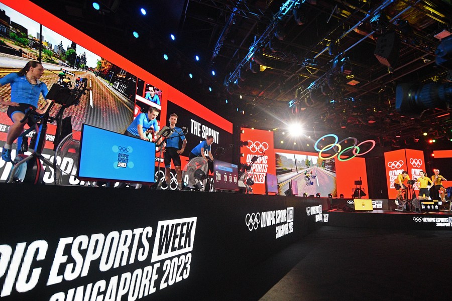 Participants compete during the cycling event at the 2023 Olympic E-Sports Week held in Singapore on June 23, 2023. (Photo by Then Chih Wey/Xinhua)